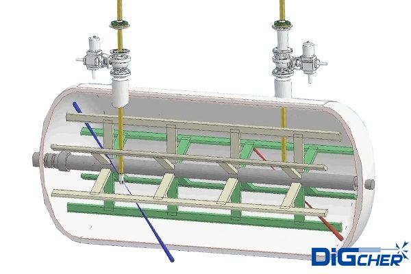 德高潔PVDF臥式反應(yīng)釜自動(dòng)化清洗系統(tǒng),采用移動(dòng)式擺角機(jī)械臂的高壓水清洗裝置,清洗時(shí),將多點(diǎn)定位機(jī)械臂小車移動(dòng)至反應(yīng)釜附近,打開清洗孔,人工手動(dòng)操作清洗機(jī)構(gòu)入反應(yīng)釜內(nèi),放到合適清洗位置,連接好高壓水管,啟動(dòng)高壓泵站工作給高壓三維清洗機(jī)構(gòu)提供高壓水,開啟清洗工作,清洗機(jī)構(gòu)可以人為設(shè)定釜內(nèi)定點(diǎn)位置,也可以自動(dòng)設(shè)定自動(dòng)完成多點(diǎn)定位清洗,清洗時(shí)間可調(diào)。完成后自動(dòng)停機(jī),人工輔助將清洗機(jī)構(gòu)移出釜內(nèi),封閉清洗口。清洗過程均按照調(diào)試好的最佳清洗時(shí)間和清洗位置自動(dòng)完成。即使只有一個(gè)人孔可以進(jìn)入作業(yè),也能高效完成釜內(nèi)清洗,真正做到無死角;設(shè)備操作輕松自如。